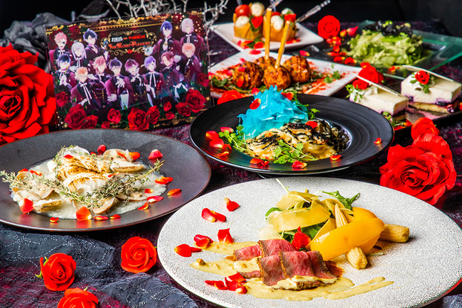 VAMPIRE CAFEに仕えることになった執事姿の13人のキャラクターイラストは、今回のコラボのための描き下ろし。全キャラクターが集合した甘美過ぎる“記念写真”が焼きつけられたアクリルパネルがそっと食卓に飾られる予約数限定のコースです。“記念写真”のフレームを縁取るのは、館の主人の象徴・薔薇ですが、そのカラーバリエーションも、紅と白の2色あり、いずれを選ぶか迷ってしまうほどです。