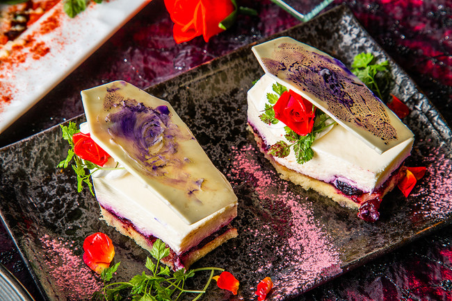 穢れなきまま生涯を閉じた哀れな乙女が眠る棺桶をモチーフにした美しきデザート。薔薇も手向けられ、静謐な祈りの場のはずですが、紫を自らのイメージカラーとする吸血鬼の影が…?そんな物語をも忍ばせた館の料理人の自信作は、爽やかなレアチーズとブルーベリー各々の酸味と、ホワイトチョコレートの甘さがベストバランスで、晩餐の幕を鮮やかに締めくくってくれます。