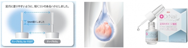 4月5日に新発売される本製品は、一般的なネイルケアで多く用いられるオイル・クリームやハードナータイプとは異なり、水溶性の製剤で爪自体に浸透して補修するネイルケア美容液です。爪保護成分を傷んだ爪の内側まで直接浸透させることができるため、ダメージを補修し、爪自体を強く健やかに保ちます。さらっとしたテクスチャーですぐに乾き、ニオイもないので使いやすくなっています。手と比べると、足は気軽に洗うことが難しいもの。一日中靴や靴下などを履くことが多いこともあり、蒸れやすく細菌が繁殖しやすい環境になっています。このことから、「ディープセラム for FOOT」には「製剤の抗菌保存剤」を配合しました。また、足爪の伸びは遅く、生え変わるのに約1年かかると言われていますので、毎日のケアが大切になってきます。「足爪が傷んで思うようにネイルを楽しめない」「爪の弱さや割れやすさが気になる」「手爪だけでなく、足爪にも使ってみたい」という方におすすめです。