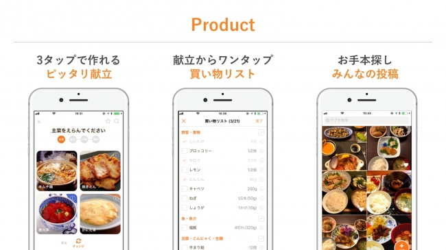 タベリーは「何を作ろう?」という献立の悩みに応えるアプリです(現在はiOS版のみ提供)。大きく3つの機能を提供いたします。