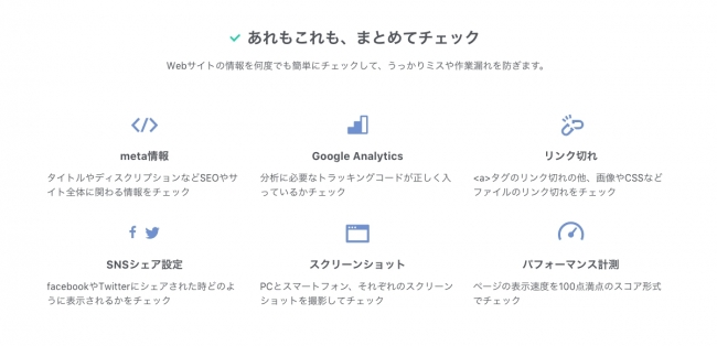 meta情報、Google Analyticsの計測タグ、リンク切れ、SNSシェア設定、スクリーンショット、パフォーマンス計測などの汎用的な項目についてページごとにチェックします。