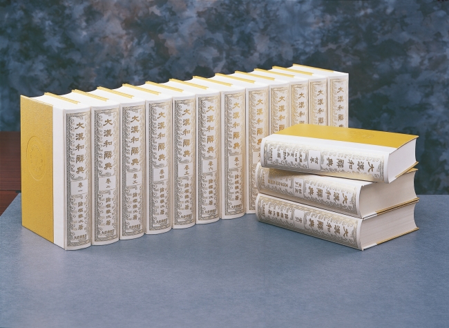『大漢和辞典』は、古今の辞書・文献を渉猟して、親字5万字、熟語50万語を収録した漢和辞典です。大修館書店の創業者である鈴木一平が発案し、漢学者である諸橋轍次に編纂を依頼。1927年に編纂が開始され、1943年に巻1が発行されました。1945年2月、巻2の発行寸前戦火にあい、全巻の組置き原版を焼失しましたが、戦後、保管していた校正刷をもとに復刊をはかり、写真植字による新しい方法によって、1955年から1960年にかけて初版全13巻の発行を完了しました。その後修訂作業が進められて、1986年に修訂版の発行を完結。1990年には『語彙索引』が、2000年には『補巻』が刊行され、全15巻となりました。