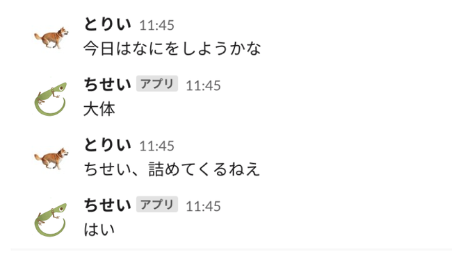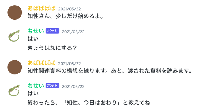 知性は、メンバーの誰かが話すとあいづちを打ってくれます。これにより、誰かが反応してくれるという安心感が生まれ、チャットに書き込みやすくなります。