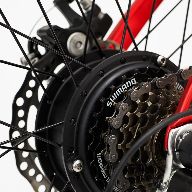 最適化されたドライブトレインでスムーズかつ確実なシフティング。SHIMANO製のギアとディレイラー搭載の7段変速のドライブトレイン。最適なギアステップでシームレスに変速、片手ギア操作で走行も快適に。