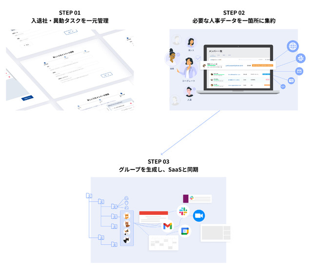 - ノーコードで従業員情報や組織に基づくグループ作成と各SaaS間での自動連携を実現できる