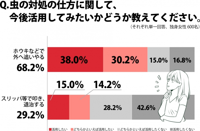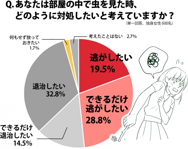日頃の生活と「もし、お部屋に虫がいたら」というシチュエーションに基づいた今回の調査では、ひとり暮らし女性の約2人に1人(48.3%)が、部屋で虫を見つけたら「逃がしたい」と答え、その意向も「スリッパ等で叩き、退治する」よりも「ホウキなどで外へ追いやる」ほうが2倍以上も高いことが明らかになりました。