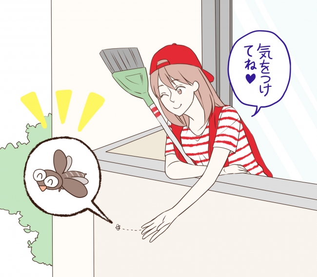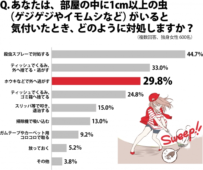 具体的な対処方法について尋ねた質問で「防虫スプレー(44.7%)」に次いで挙げられたのが「ティッシュでくるみ、外へ捨てる・逃がす(33.0%)」「ホウキなどで外へ逃がす(29.8%)」行為でした。