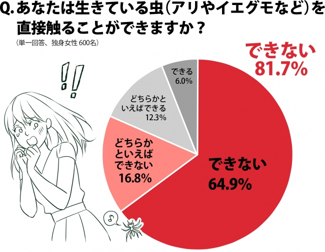 虫はやはり「触れない」ものです。体長1cm以下のアリやイエグモなどの小さな虫でも81.7%の女性が「触ることができない」と回答しました。