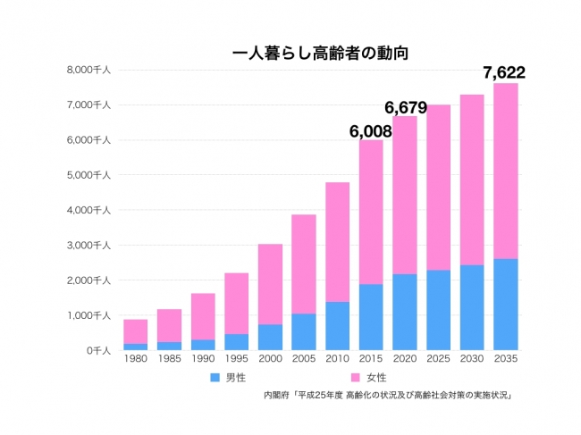 内閣府の統計資料によると、一人暮らし高齢者は年々増加しており、2015年には全国総世帯数の1割超におよぶ6