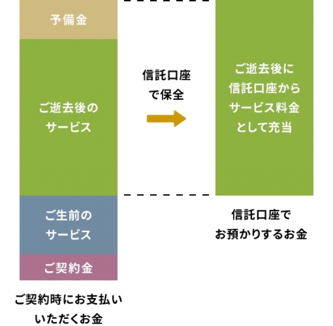 ご利用者様が亡くなった後までお預かりする葬儀や死後手続き代行などの終末資金は、全額を信託口座で安全に保全。安心して終末資金を託せます。