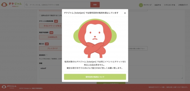 ただ、本当に行きたかったのに仕事や急病で急に行けなくなったりすることは起こりうる事で、そんな時に他に行きたい人がいるのにも関わらずチケットがただ無効になってしまうことも誰も幸せにならないことだと考えています。なのでチケジャムは大量のチケット出品に対して制限をかけております。