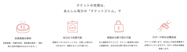 チケジャムでは、取引完了するまで代金を一時的に預かるシステムを導入し、公演を楽しむまで安心・安全にやり取りが可能になります。また興行主への売上還元システムを導入し、チケジャムの理念に賛成していただける興行主の方にはチケジャムで発生した利益を還元させていただきます。さらにチケット二次流通の大きな問題の一つ、転売に対しても、出品できるチケットの出品可能枚数を制限することをはじめ、興行主と協力し1次流通を含め理想的な仕組みづくりに取り組んでいます。