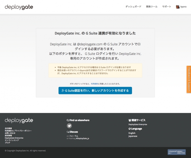 ・「G Suite」と連携した「DeployGate Enterprise」専用のアカウントが新たに作成され、個人向け「DeployGate」のアカウントから分離されます。