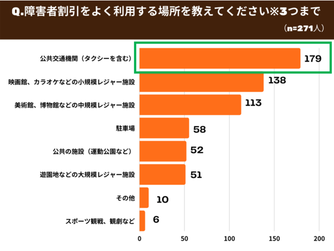 2021年2月にミライロIDユーザー271名が回答したアンケート調査(※1)では、「障害者割引をよく利用する場所」として179名が「公共交通機関」と回答し、最も利用頻度が高いことがわかりました。