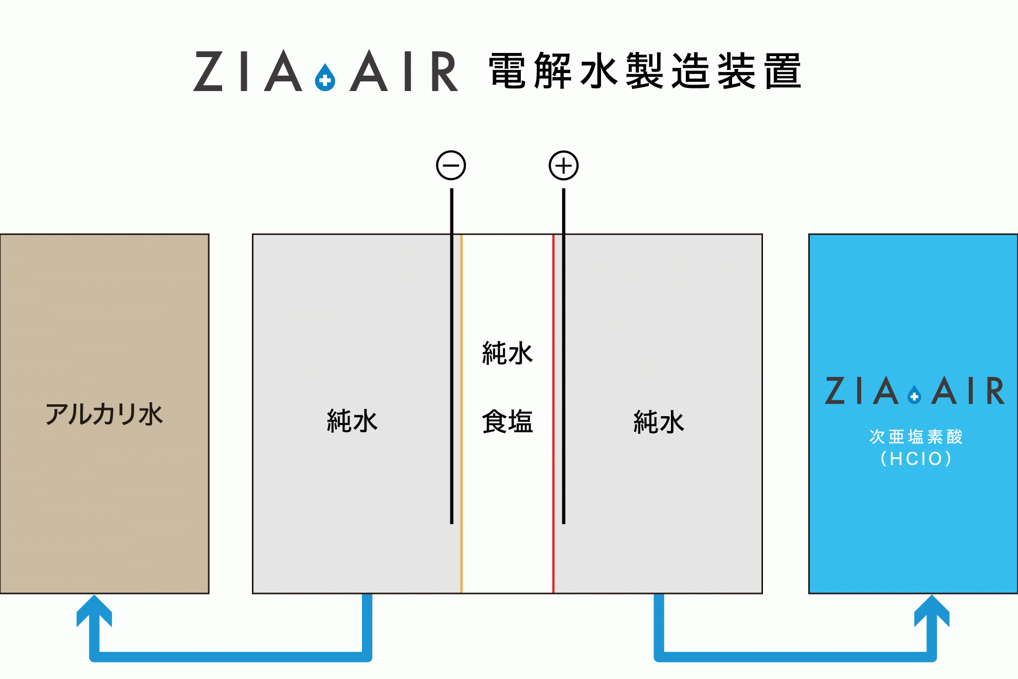 ZIA AIR(ジアエアー)は特許技術製法(2膜3室型電解装置)で、不純物の無い高純度の次亜塩素酸(HClO/エイチシーエルオー)の生成を可能にしました。