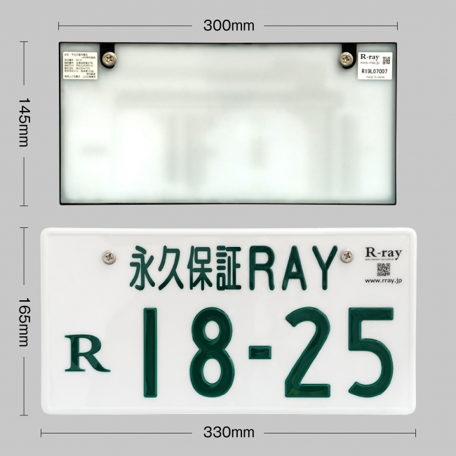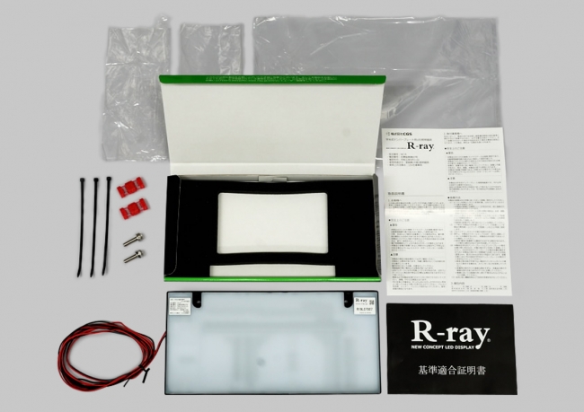 このたび蓄積した設計ノウハウを車載用LED照明分野に反映し、独自の特徴を有する字光式ナンバープレート用LED照明器具「R-ray」を開発することに成功しました。国内で生産管理され車検適合製品である「R-ray」の特筆すべき点は、輝度ムラ改善、永久保証、いつまでも新品の明るさを維持できることです。