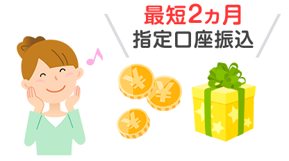 キャッシュバック特典の進呈時期は、課金開始月の翌々月末(例:課金開始が1月なら3月末振込)です。お客さまご指定の口座にお振り込みいたします。