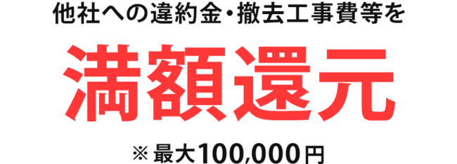 新たにソフトバンク光をお申し込みいただいた方に、「他社固定回線」または「他社モバイル回線」の違約金・撤去工事費等を最大100,000円(税込)キャッシュバック。