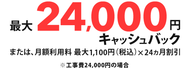 他社回線からソフトバンク光に乗り換えでご利用いただくお客さまに、最大24,000円キャッシュバックまたは、月額利用料から1,100円(税込)×24ヵ月割引(工事費24,000円の場合)。