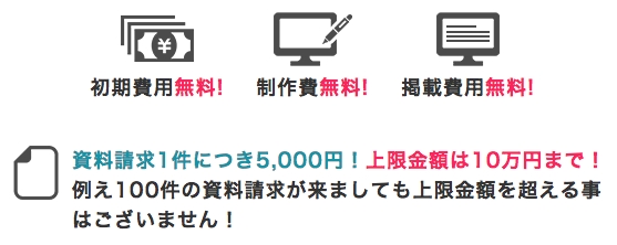 費用につきましては初期費用/作成費用/掲載料金は一切かかりません。当社サービスは準成果報酬型であるため、資料請求1件にき5,000円と業界最安値!しかも資料請求21件目からはそれ以上の料金はいただきません!