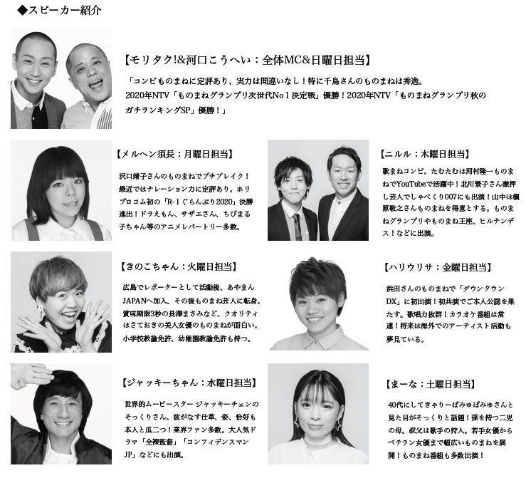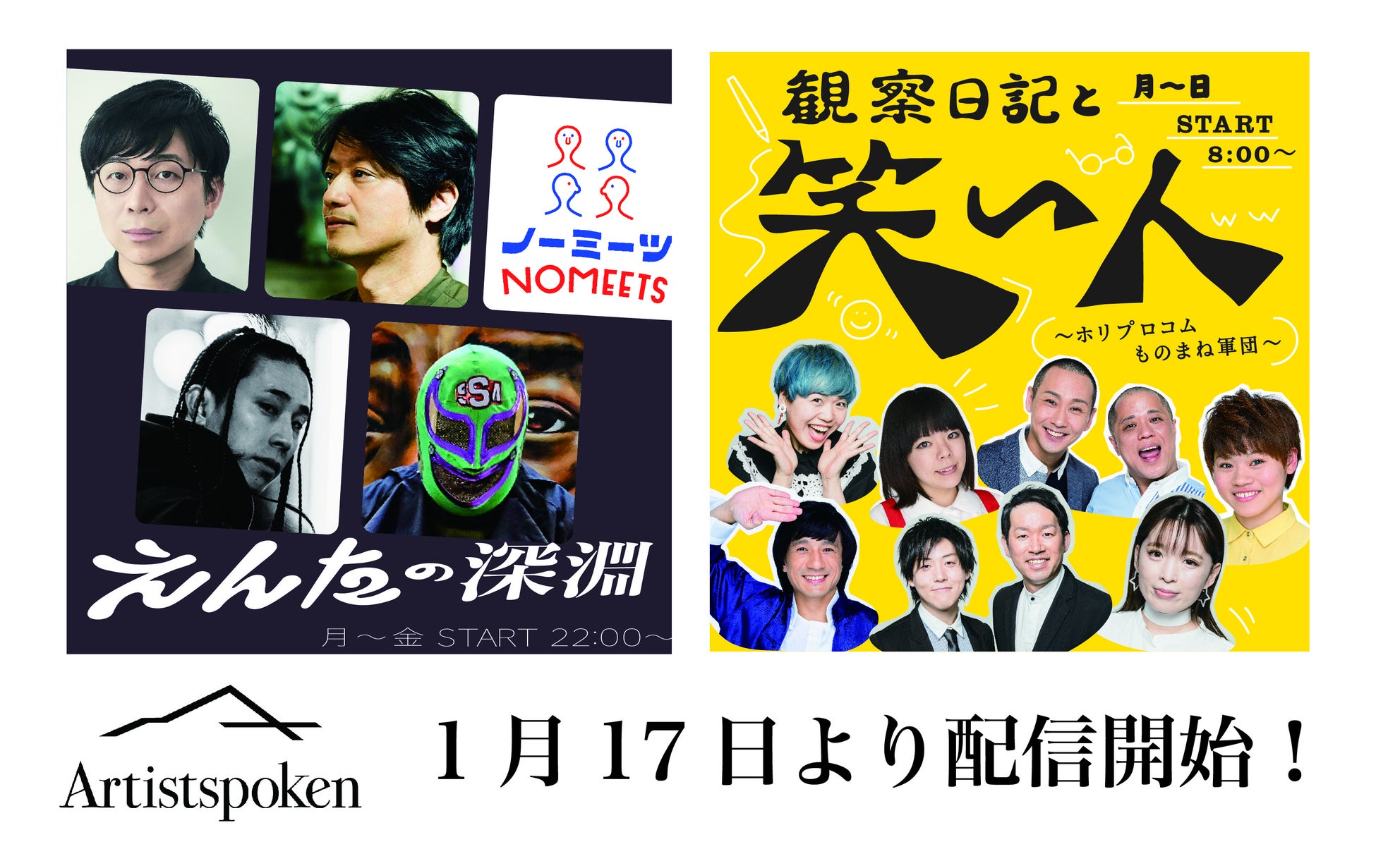 映画監督・お笑い芸人・小説家など80名を超えるアーティストが一同に集い、ここでしか聴けないオリジナルエピソードを提供するアーティスト特化型音声配信サービス「Artistspoken」https://artistspoken.com/lp/にて、本日2022年1月17日より、テーマ性をもった表現者の声を日替わりでお届けする「帯番組」をスタートいたします。ラインナップは、毎日朝8時から”観察眼”に長けたホリプロコムものまね軍団による”クスっと笑える朝の時間”をお届けする「観察日記と笑い人〜ホリプロコムものまね軍団〜」、月〜金22時からは、5組のスピーカーによる独自の視点からエンターテイメントを深掘りする「えんたの深淵」を配信開始いたします。