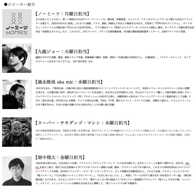 本番組は、まだ出会ったことのない新しい物語を生み出すストーリーレーベル「ノーミーツ」、ポップカルチャーから伝統芸能まで執筆し、数多くの書籍やメディアの編集も手がけるライター・編集者「九龍ジョー」、日本の才能が活躍できる未来を作ることを目標に掲げ活動するHYTEK Inc.代表「満永隆哉 aka mic」、新潟在住で国籍・年齢一切不明の謎の覆面レスラー「スーパー・ササダンゴ・マシン」 、2021年dea inc.を設立し独立、現在では広告領域からTVドラマやバラエティ番組の企画・脚本・プロデュースまでを手掛ける「畑中翔太」が登場。