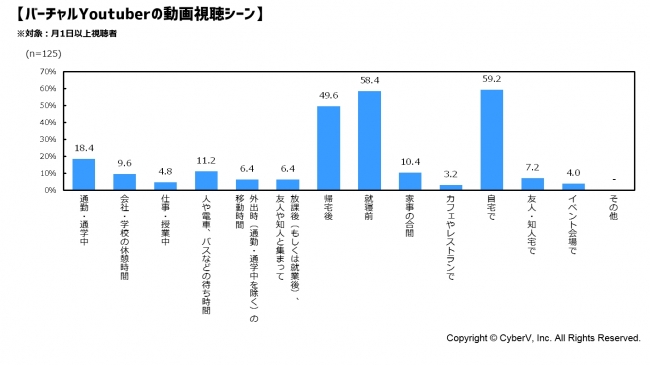 ・バーチャルYoutuber認知者全体の約50%が帰宅後に、約60%が就寝前に視聴すると回答