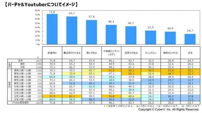 - バーチャルYoutuberの認知率は約41.8%、10代・20代男女は過半数が認知