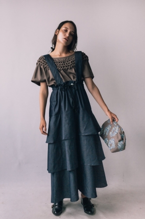 軽快な生地を贅沢に使用した、ジャンパースカートです。3段の大きなラッフルは後ろ下がりにやや長いシルエットになっており、女性らしい曲線を強調しております。動くたびに大きく揺れエレガントな印象を与えます。