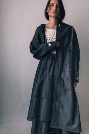 背中に大胆なスモッキングを施したスプリングコートです。スモッキングにより出る独特のフォルム感が女性らしさを演出されます。前身頃は、立体的なポケットになっており、メンズライクな一面も施されております。袖はボタンを取ればフレアスリーブに、閉じれば膝のあたりにボリュームが出る設計です。