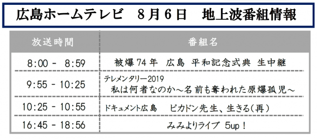 広島ホームテレビでは、8月6日(火)あさ8時から、無料動画配信サービス「HOMEぽるぽるTV」にて地上波番組「被爆74年 広島 平和記念式典 生中継」のネット同時配信を実施します。