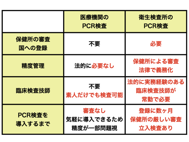一方で、現在、日本国内で急増している新型コロナウイルスのPCR検査は、法律上、審査なく開設できるクリニックの検査室で簡易的に行われているため、監視体制・精度管理が不十分とも言われており、ビジネス化目的での開設も多く、一部で質の低下が危ぶまれている。