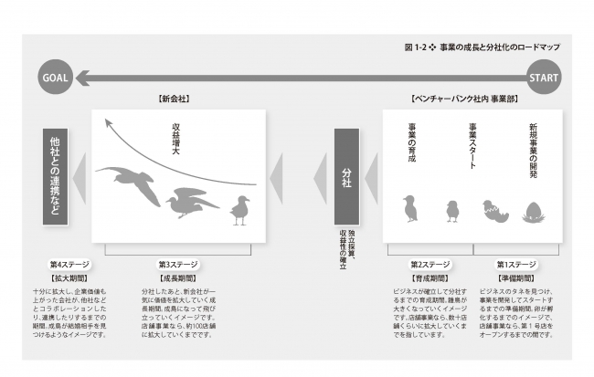 新規事業のスタートからゴールまでをイメージした新たな経営モデルを創出。あらかじめ目標(分社化)とゴール(価値創造・拡大)を定め、新規事業に取り組むための仕組みをつくり、「見える化」しました。ベンチャーバンクは分社のたびに売り上げは落ちますが、経営指標は売り上げや利益ではなく、インキュベーション・カンパニーとして、「どれだけ新規事業の成功例を生みだしていけるか」ということになり、これまでに無い新しい経営スタイルを持つ会社となります。