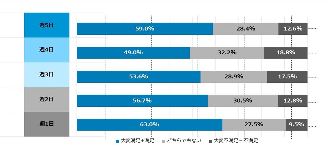テレワークを実施する日数別にテレワークの満足度を調査したところ、週一日が63%と最も高く、週二日56.7%、週三日が53.6%、週四日が49%と日数が増えるごとに満足度が低下しました。