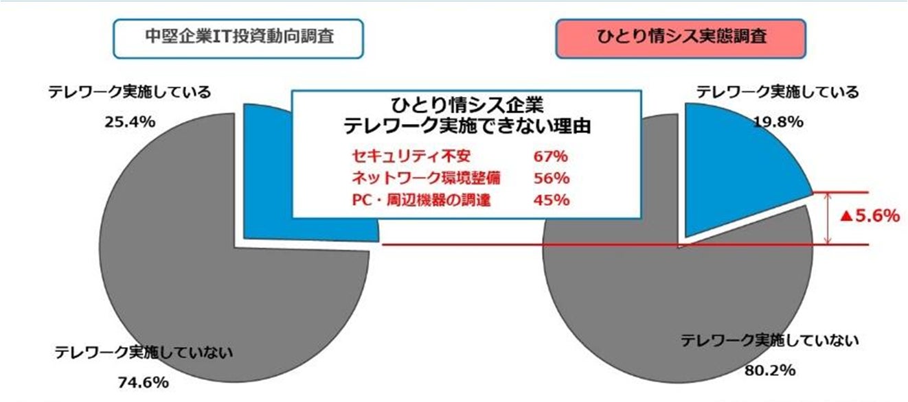 ひとり情シス企業のテレワーク率は、中堅中小企業平均を5.6%下回る