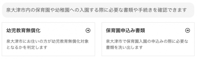 「幼児教育無料化 手続きガイド」は、今回の実証実験において泉大津市と共同開発したものであり、幼児教育の無償化において当サービスを利用するのは全国の市町村で初めてとなります。