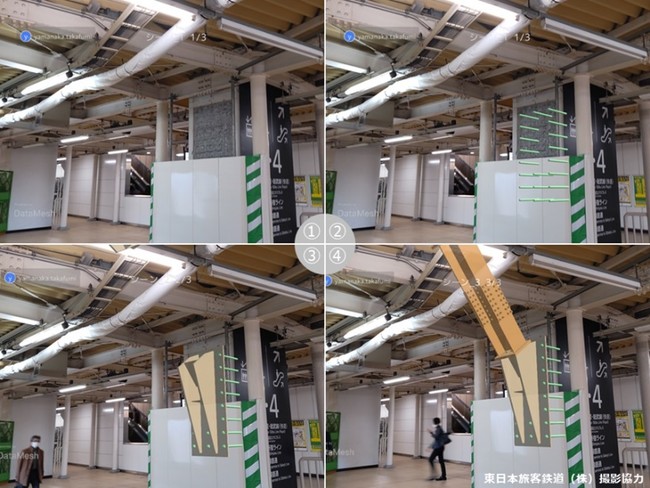 駅の改良工事など営業線近接の鉄道工事は、一晩の作業時間が終電から始発までの数時間に限定されることから、作業の手戻りは大きな損失になります。そのため作業手順の確認には発注者、元請、協力会社の作業員の間で綿密な協議を重ね、各役割を徹底させるまで多くの時間を費やすことが必要でした。そこで今回の試行では、Microsoft HoloLens 2やタブレット端末を使用し、デバイスにDataMesh Directorで作成した作業手順を表示することで作業時間短縮を図りました。