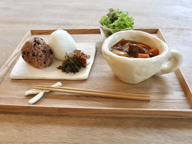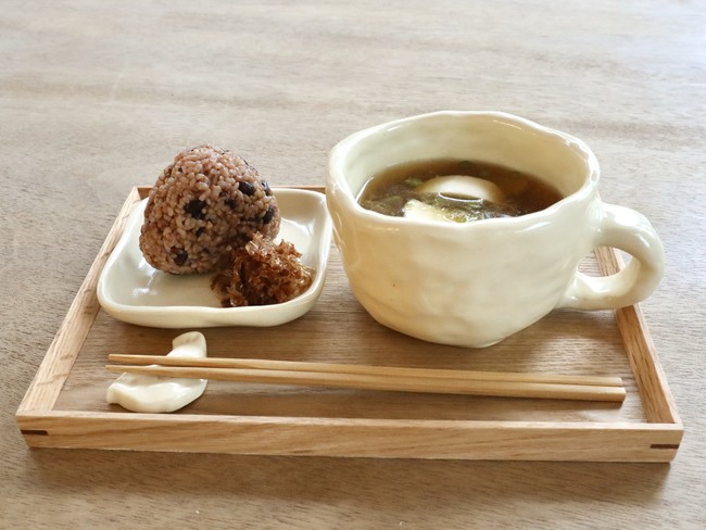 コーヒーやジュース、チーズケーキなどのカフェメニューを提供するほか、おにぎりとスープがメインとなるのが特長です。