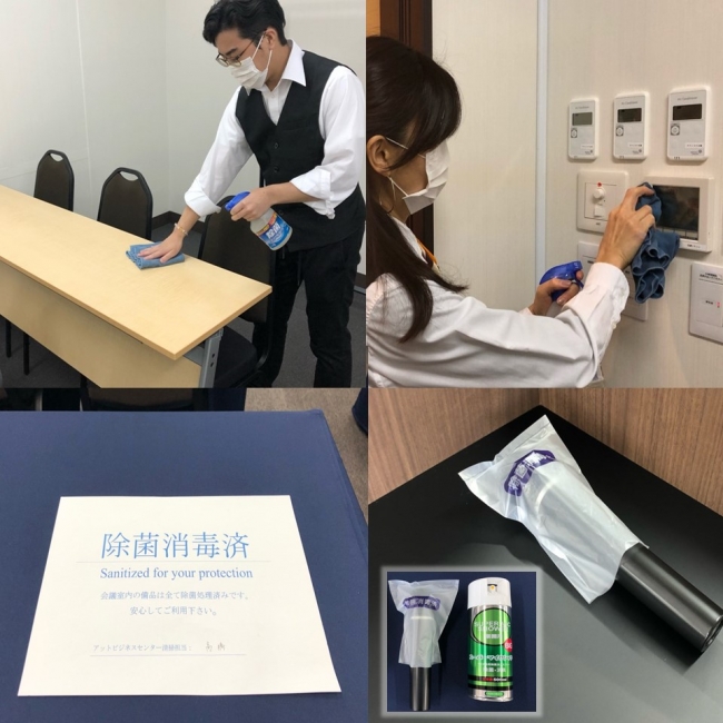 受付、ラウンジ等、共用スペース各備品において、手を触れる場所を定期的に専用除菌剤を用いた除菌・殺菌行います。