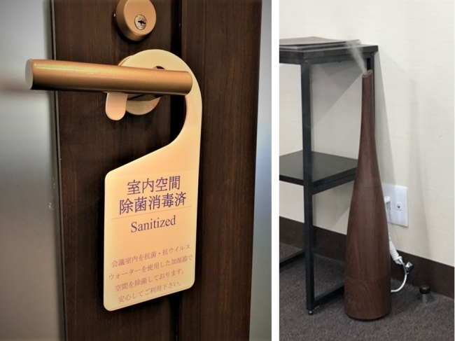 ・会議室内のデスク、イス、演台、ホワイトボード、マーカー、ハンガー、各種スイッチ類など、直接手の触れる箇所に専用除菌剤をスプレーで噴霧し、拭き上げを行います。