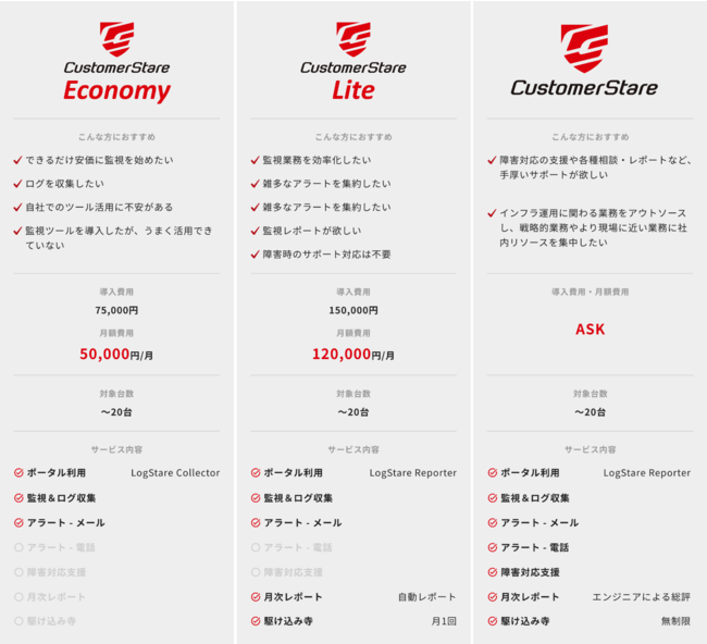 | 特典 | ・ご契約プランの初期導入費用無料(「Economy」または「Lite」) ・CustomerStareへアップグレード時の差額初期費用無料(初回ご契約より1年間有効) |