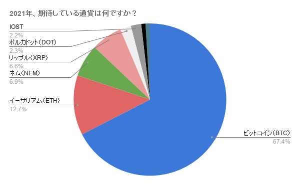 2021年に期待している仮想通貨については、1位がビットコイン(BTC)で67.4%。