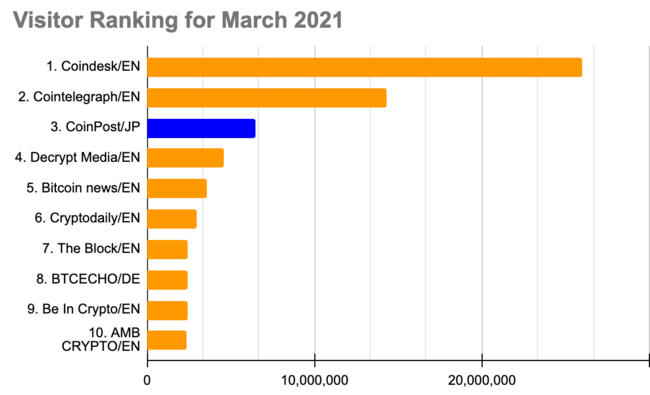 CoinPostのPV数は月間600万に達し、月間訪問者数は昨年9月以降、仮想通貨・ブロックチェーンメディアで英語圏のメディアが上位を占める中、日本語のメディアとして世界3位となっております。(Similarweb調査)