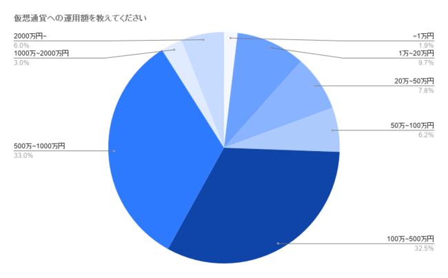 「仮想通貨の運用額」については「100万円~500万円未満」「500万円~1000万円未満」が最も多い約33%、「1000万円~2000万円未満」が全体の約3%。「2000万円以上」保有しているユーザーは全体の約6%という結果となりました。