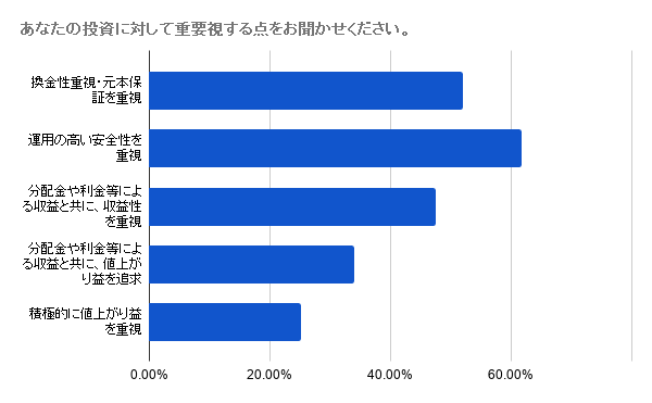 「投資で重視するポイント」では、「高い安全性・換金性・元本保証」が多くみられ、「分配金や利金等による収益性」も強く意識されている結果となりました。