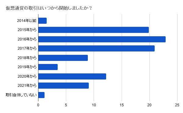 仮想通貨取引の開始時期については、「2015年〜2017年」から仮想通貨投資を開始したと言う古参ユーザーの回答も目立ちました。