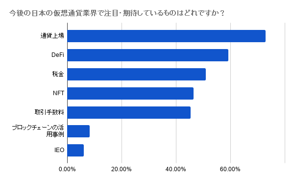 今後期待していることについては、国内の暗号資産交換業者(仮想通貨取引所)への「新規アルトコイン上場」が最も多く、「DeFi(分散型金融)」「NFT(非代替性資産)」への高い関心も見受けられました。仮想通貨高騰の影響で、税制改正についてのトピックも非常に高い関心が続いています。