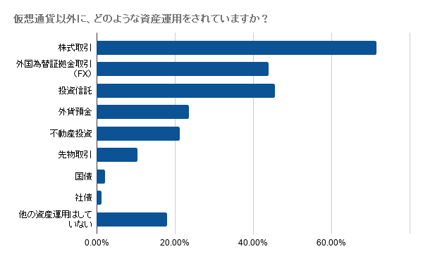 仮想通貨以外の金融商品については、株式投資が71%と最多に。投資信託が約46%、外国為替証拠金取引(FX取引)が約44%、不動産投資が約21%という結果になりました。