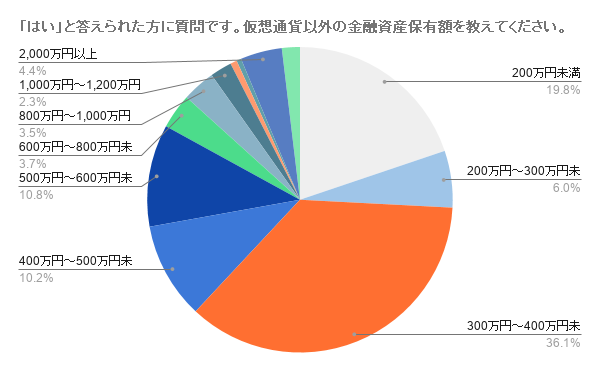 仮想通貨投資以外の運用資産額については、「300万円~400万円未満」が約36%。「200万円未満」が約20%という結果に。「2000万円以上」の回答は全体の約5%でした。