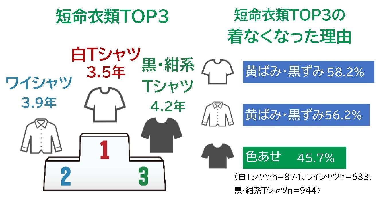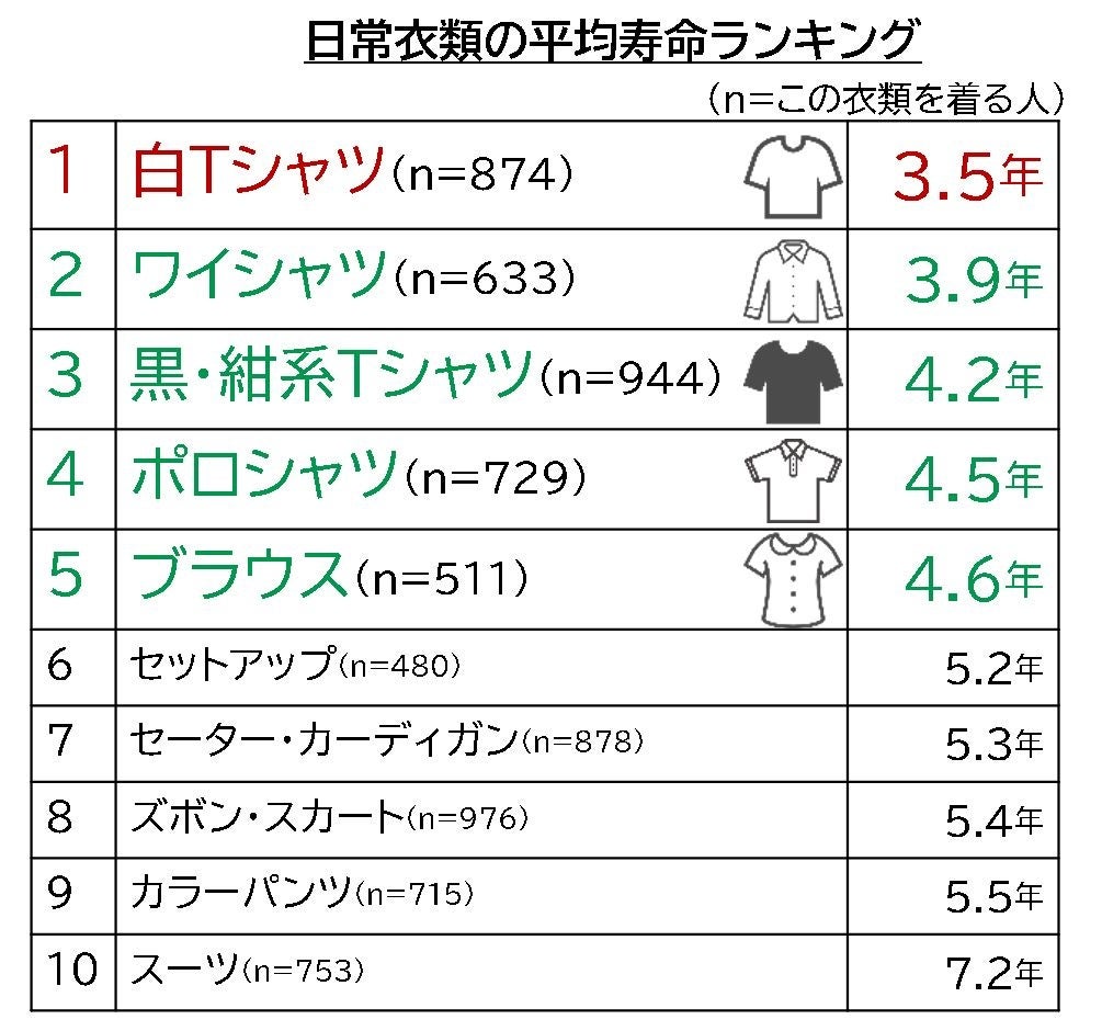 調査対象者全員に、日常的に着用する衣類について、購入してから着なくなるまでの期間を回答してもらい、衣類の平均寿命を明らかにしました。その結果、最も短命だったのは「白Tシャツ( 3.5年)」となりました。
